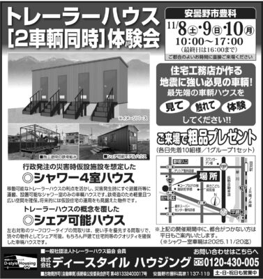 | 珍しいシャワートレーラーと戸建て住宅と同等の高性能トレーラーハウス!2台同時体験内覧会を開催します! |